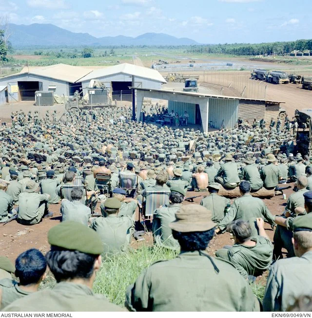 Here I am on stage in Nui Dat, singing to about 1,500 Australian soldiers.